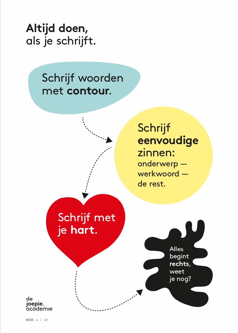 'Jippie, ik schrijf een Joepie'. You can find a copy of the book in every office. You can skim though tips book and find simple tips that directly help you tell your story. Here is a sneak peak.
