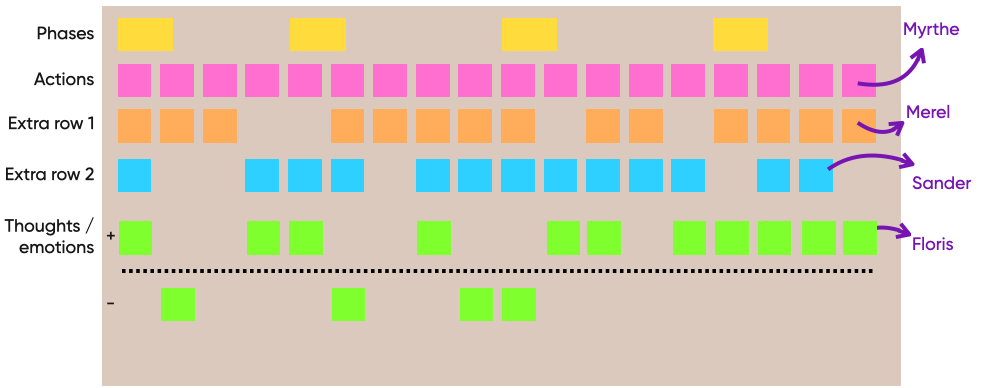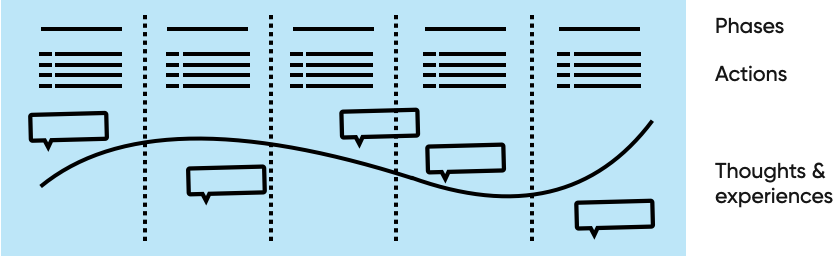 The journey consists of rows that describe the different elements in the experience of the user (actions, thoughts, emotions, etc.), and of columns that describe the phases using the elements of the experience.