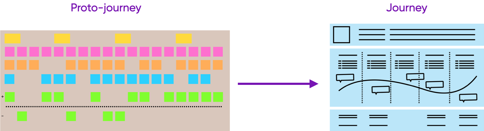 - You can use a proto-journey in which you capture the assumptions you and your team have as a starting point or to organise the info you get at the start of a project. This proto-journey can then be used to validate your assumptions during user research or with stakeholders.