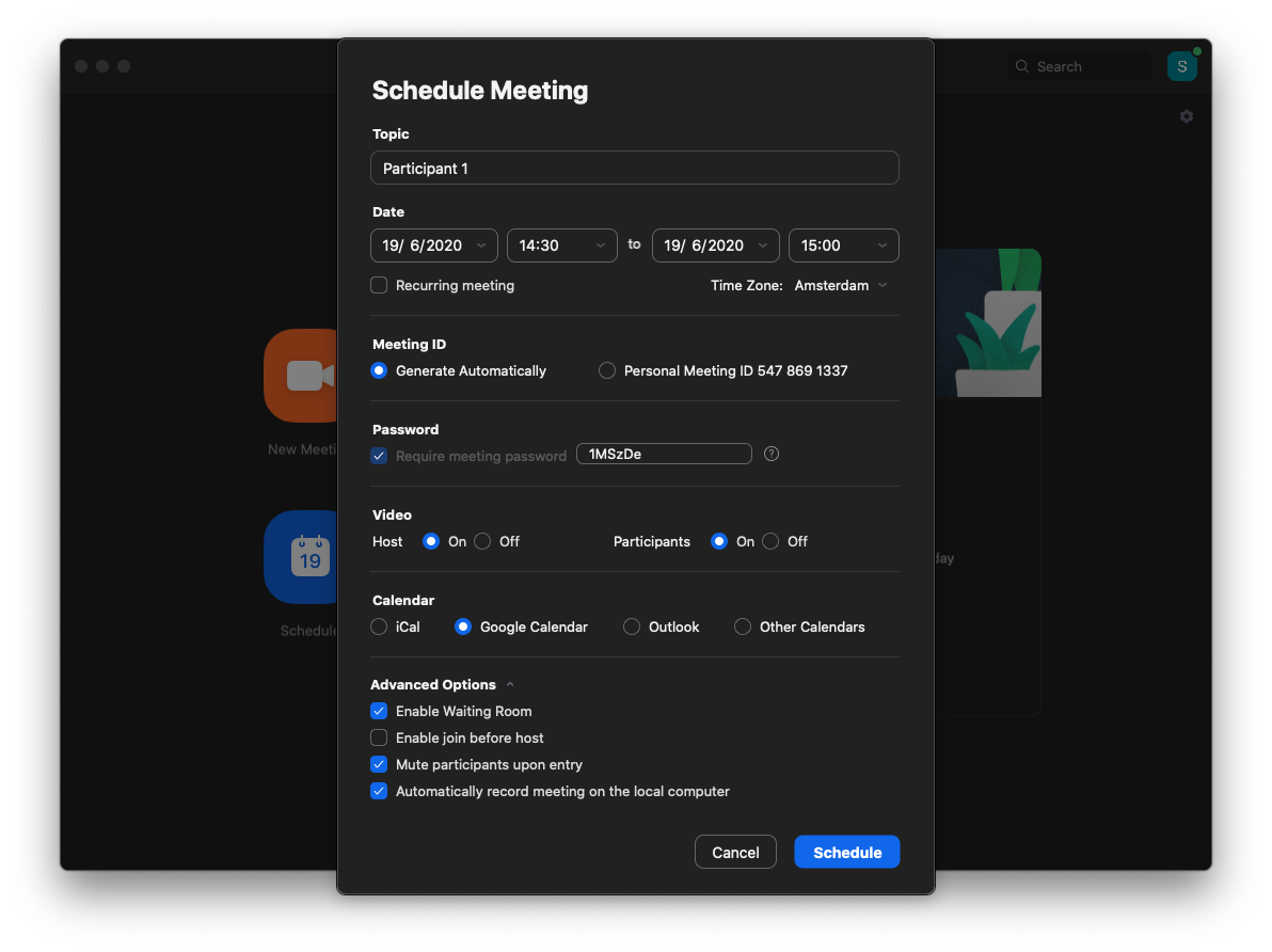 After all above has been set, hit the schedule button. This will prompt you to create a Google Calendar meeting. Here you can either copy the Zoom meeting link and send this to the participant of invite them + the observers via a calendar invite.