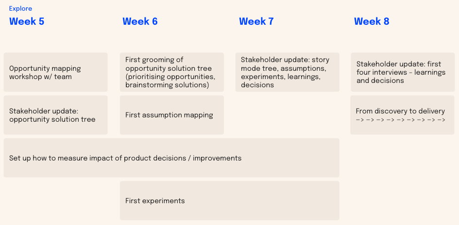 During Explore, we start with opportunity mapping, we gather data, we decide on our product outcome, we set up user interviewing, we set up stakeholder updates, we set up measuring impact, we start with assumptions mapping, and we set up experiments. Take around 6 weeks for this.