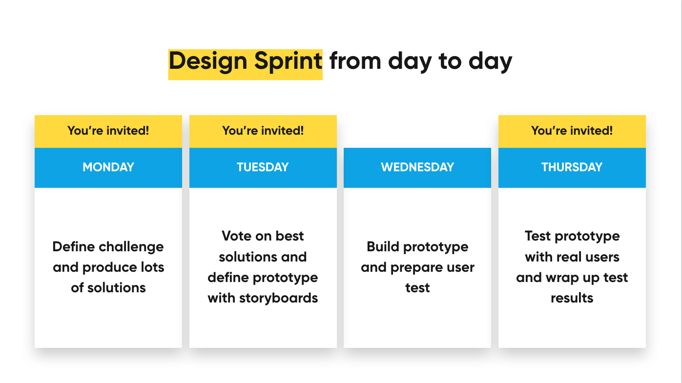Create meaningful results from scratch: Sprint is a great approach for getting quick results in just a short period of time. Developed at Google Ventures, it is a great process to start a project, getting unstuck or accelerating projects that are already in motion.