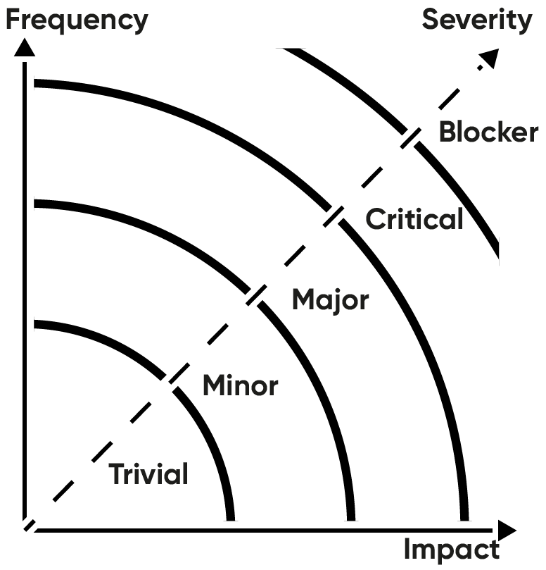 For a Product Owner, it is important to know how severe a bug is. How frequently does the problem occur? And if the problem occurs, how big is the impact? If a problem occurs rarely and the effect is minimal, the problem can be considered trivial. When a problem occurs often and has a huge impact on the usage, it's considered a blocking issue. All levels in between may be harder to define. The following scale and diagram should help to determine the severity level.